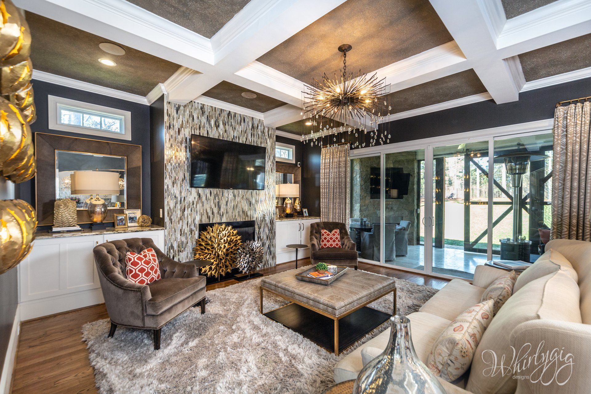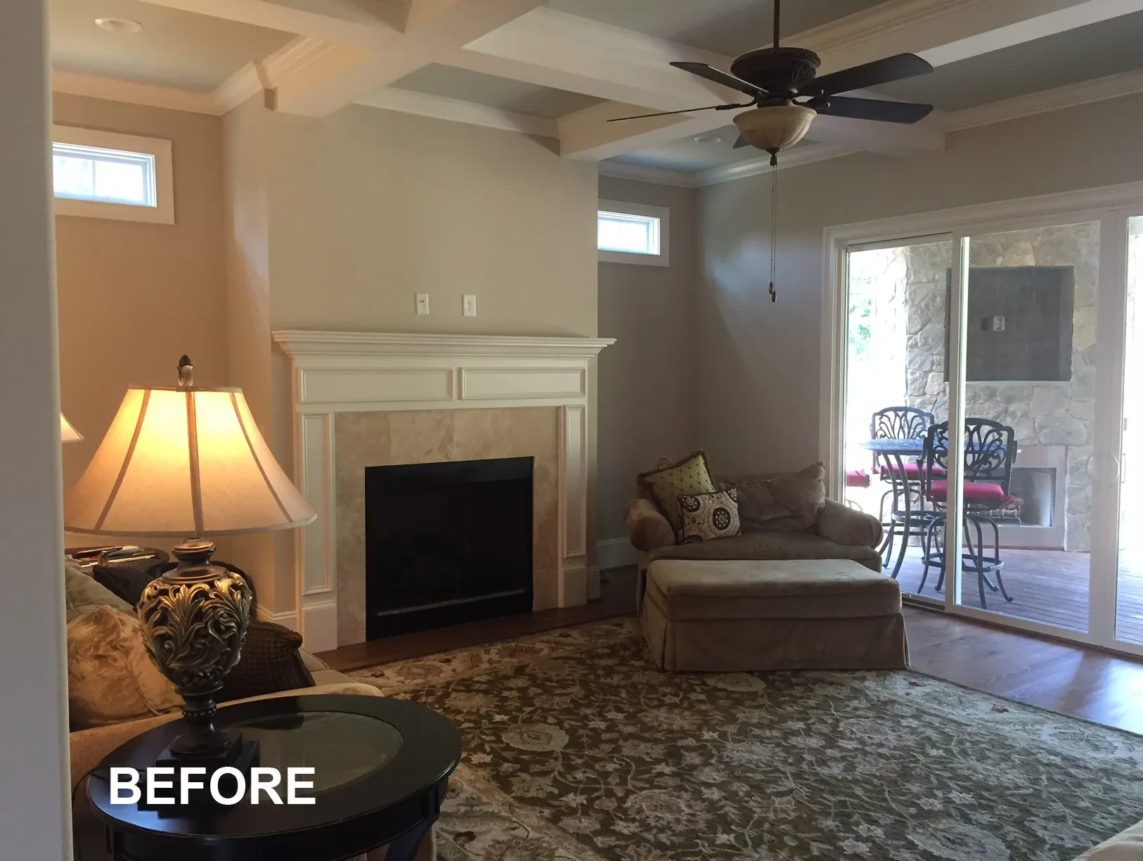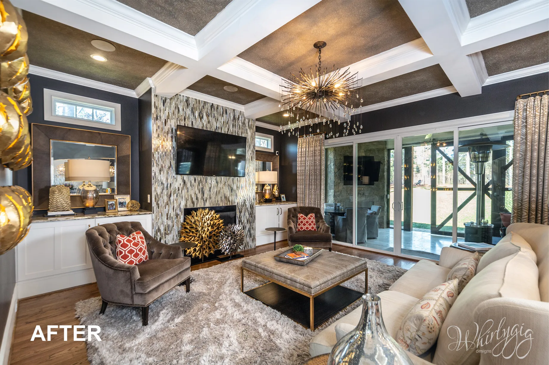 The original fireplace surround was highly traditional so we removed the entire facade and replaced it floor to ceiling with iridescent glass tile. To fill out the wall we added built-in cabinets flanking the fireplace which not only added storage but provided the opportunity for much needed lighting on that side of the room. In lieu of the fan we added a chandelier from Currey and Company and one of my signature touches is an illuminated art install-the pieces comprising this install are from Arteriors.