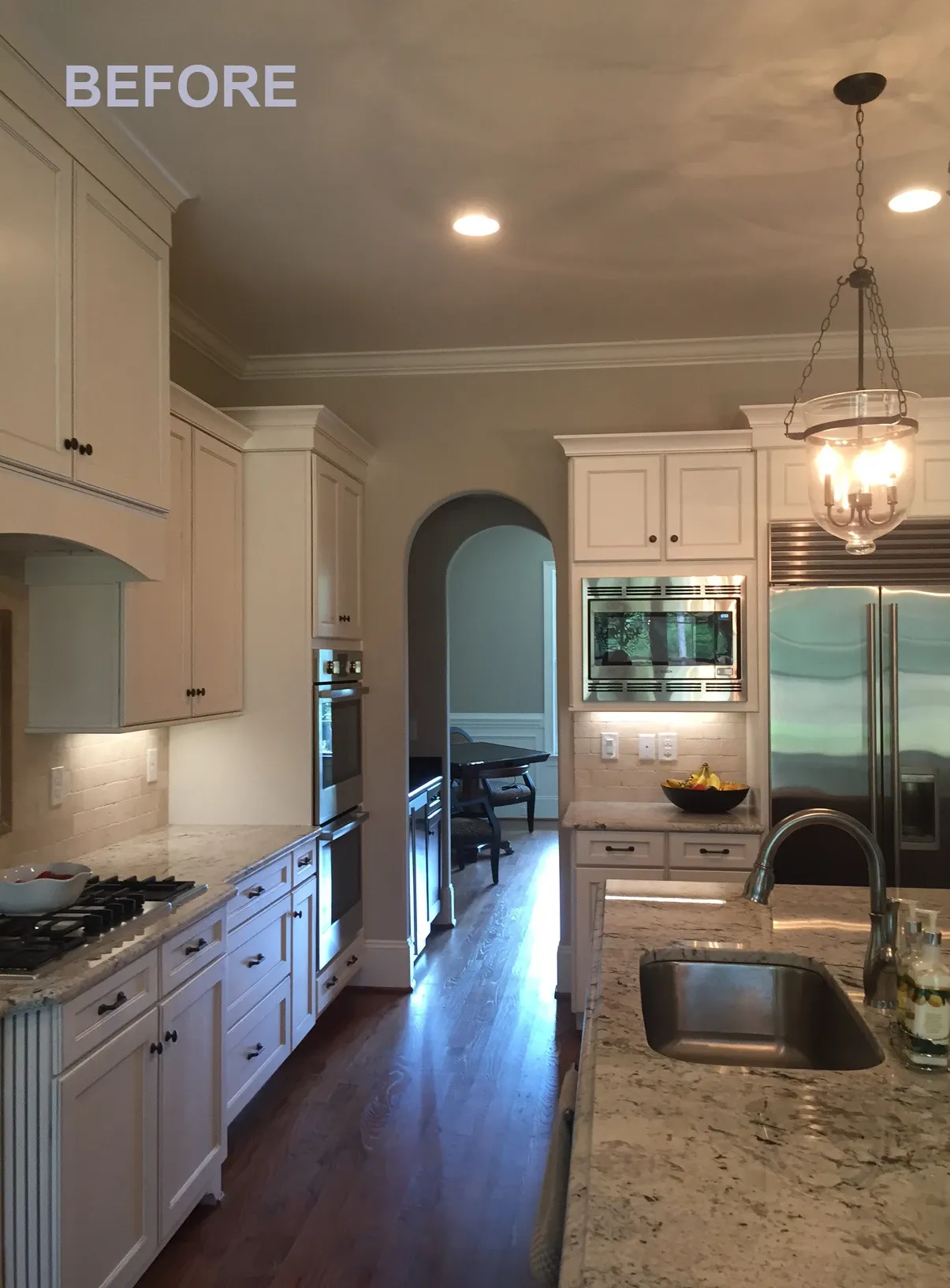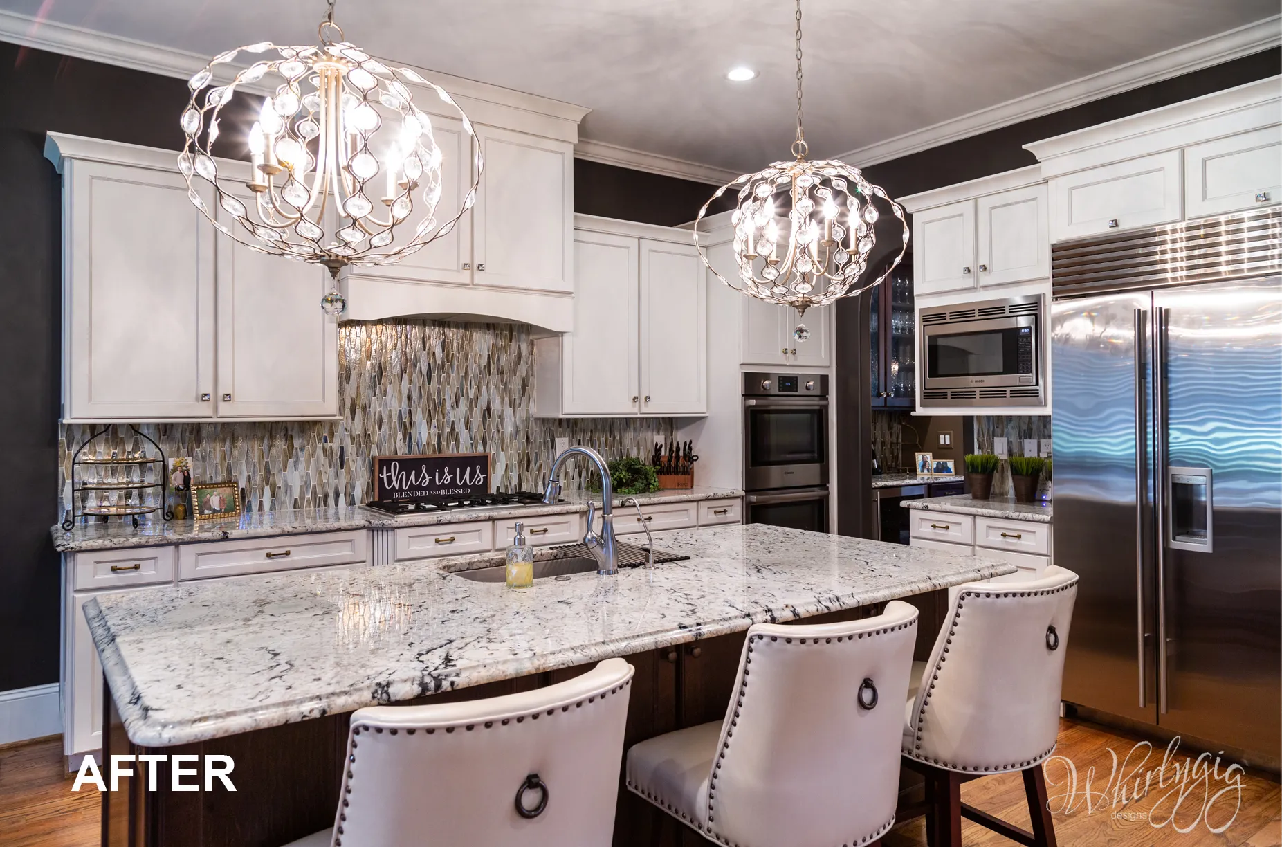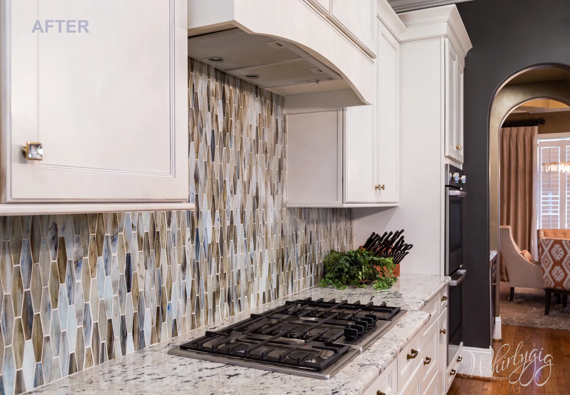 While this was a new build and technically there was nothing wrong with the existing backsplash, it was just boring. We spiced it up by bringing the iridescent tile from the hearth across the room and using it along the backsplash. This move really makes the cabinets stand out. We also swapped out cabinet hardware. Always pay attention to the small details. There… that looks better!