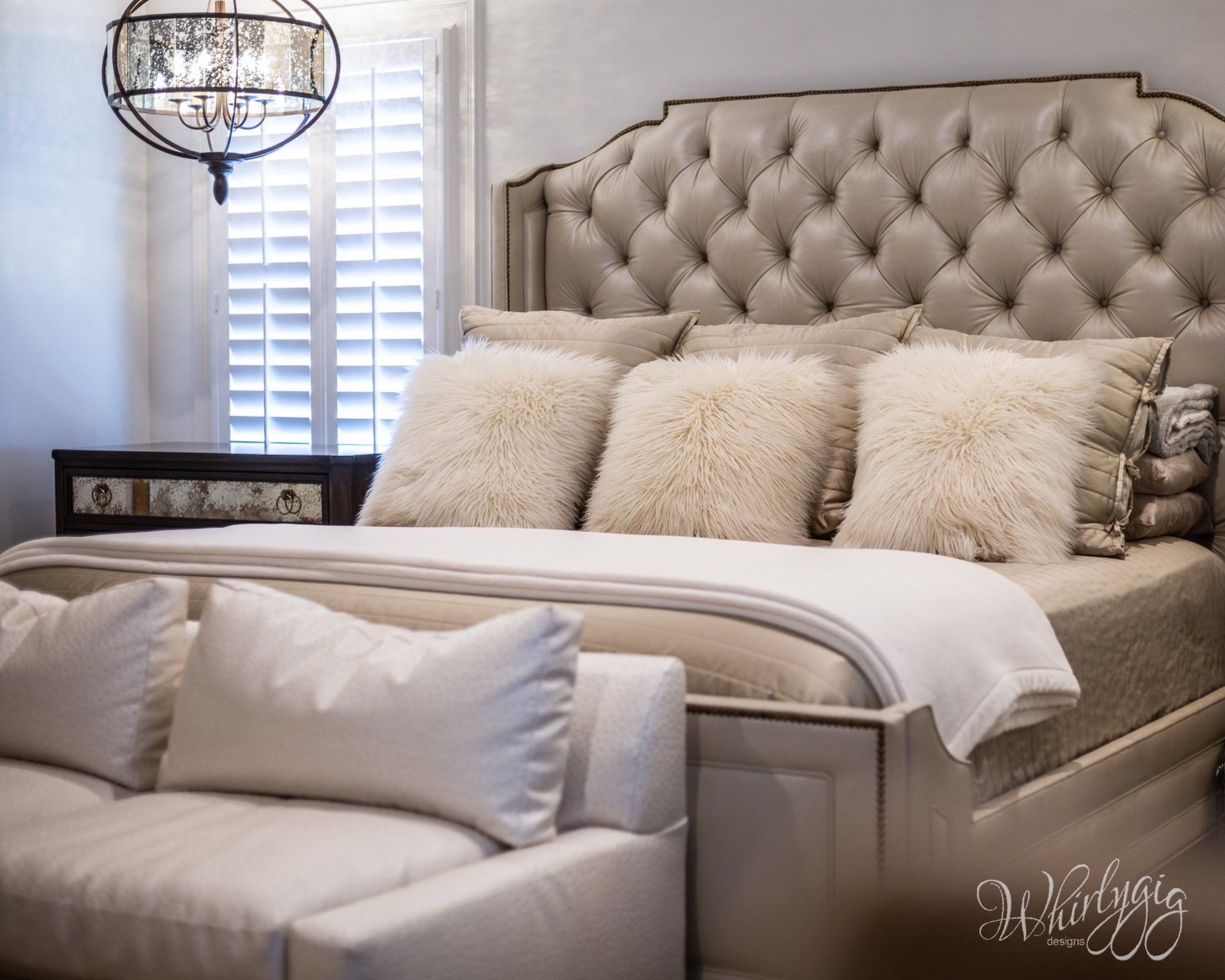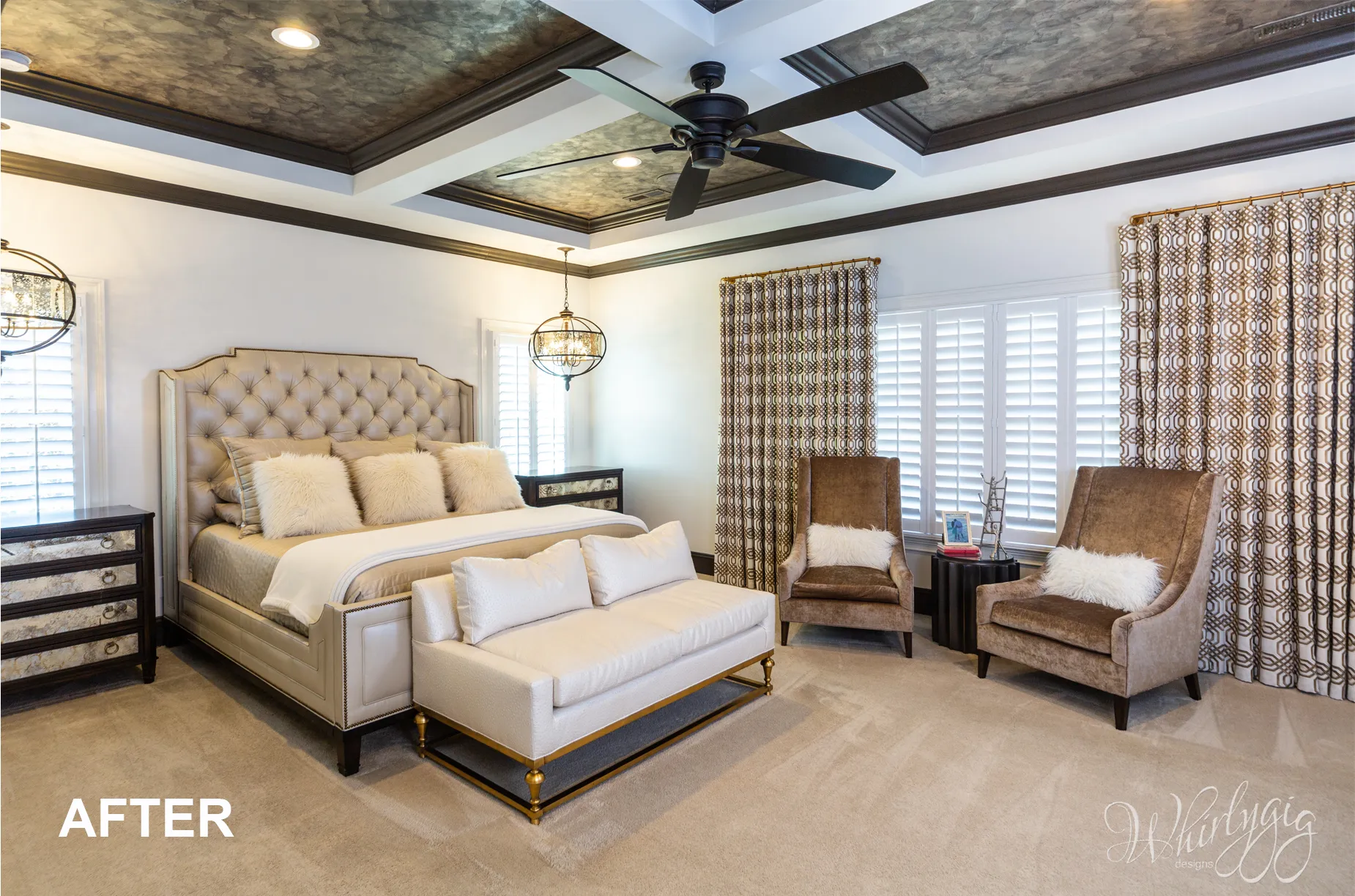 The client really wanted her master en suite to feel different from the rest of the house so we elected to go with a reverse paint scheme and played up the coffered ceilings with a specialty paint effect by Iron Petunia. The custom oversized artwork by Viapaggi balances the full wall of custom drapery by Sew Unordinary in this incredibly large master retreat. Furnishings by Vanguard Furniture chandeliers by Currey and Company.
