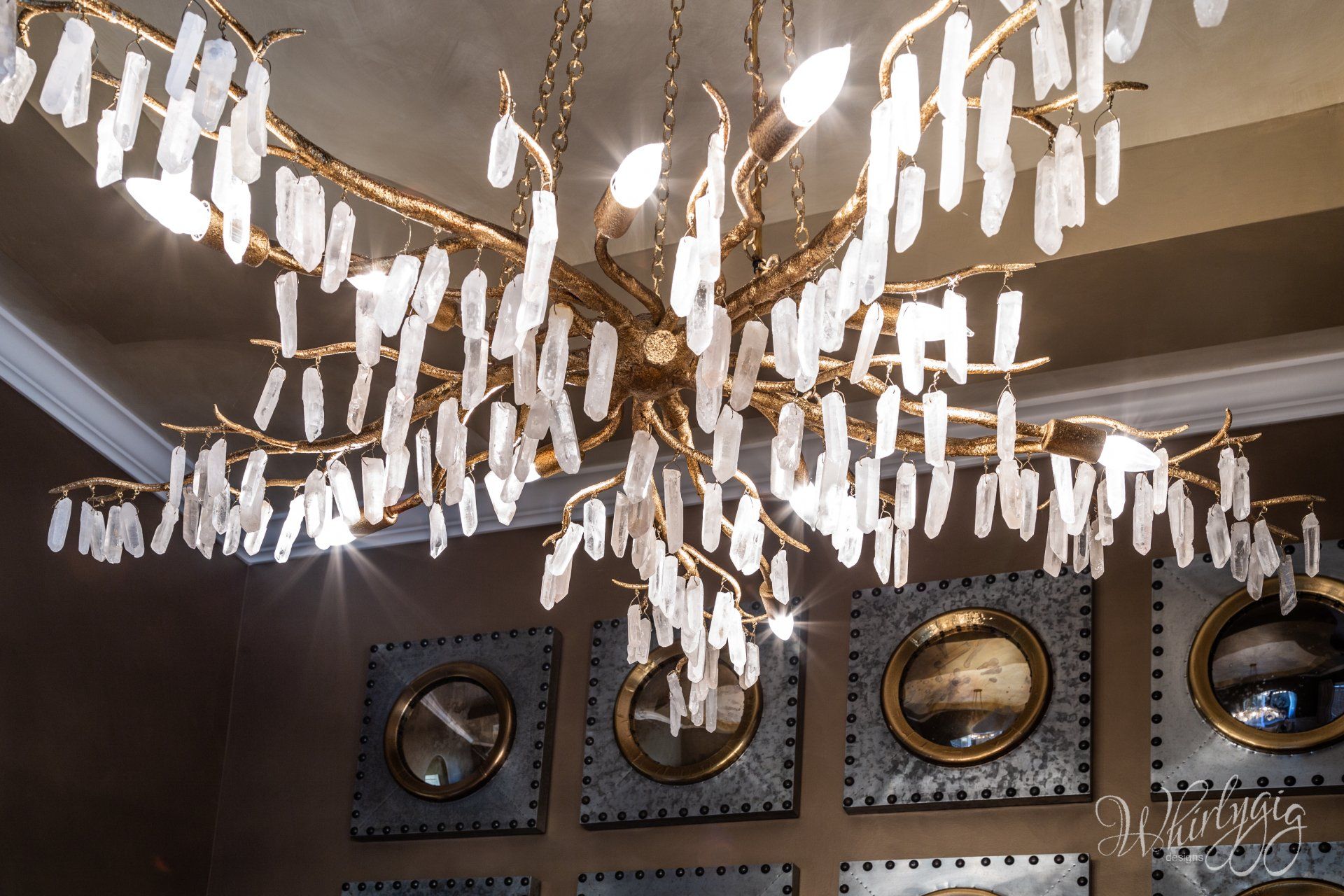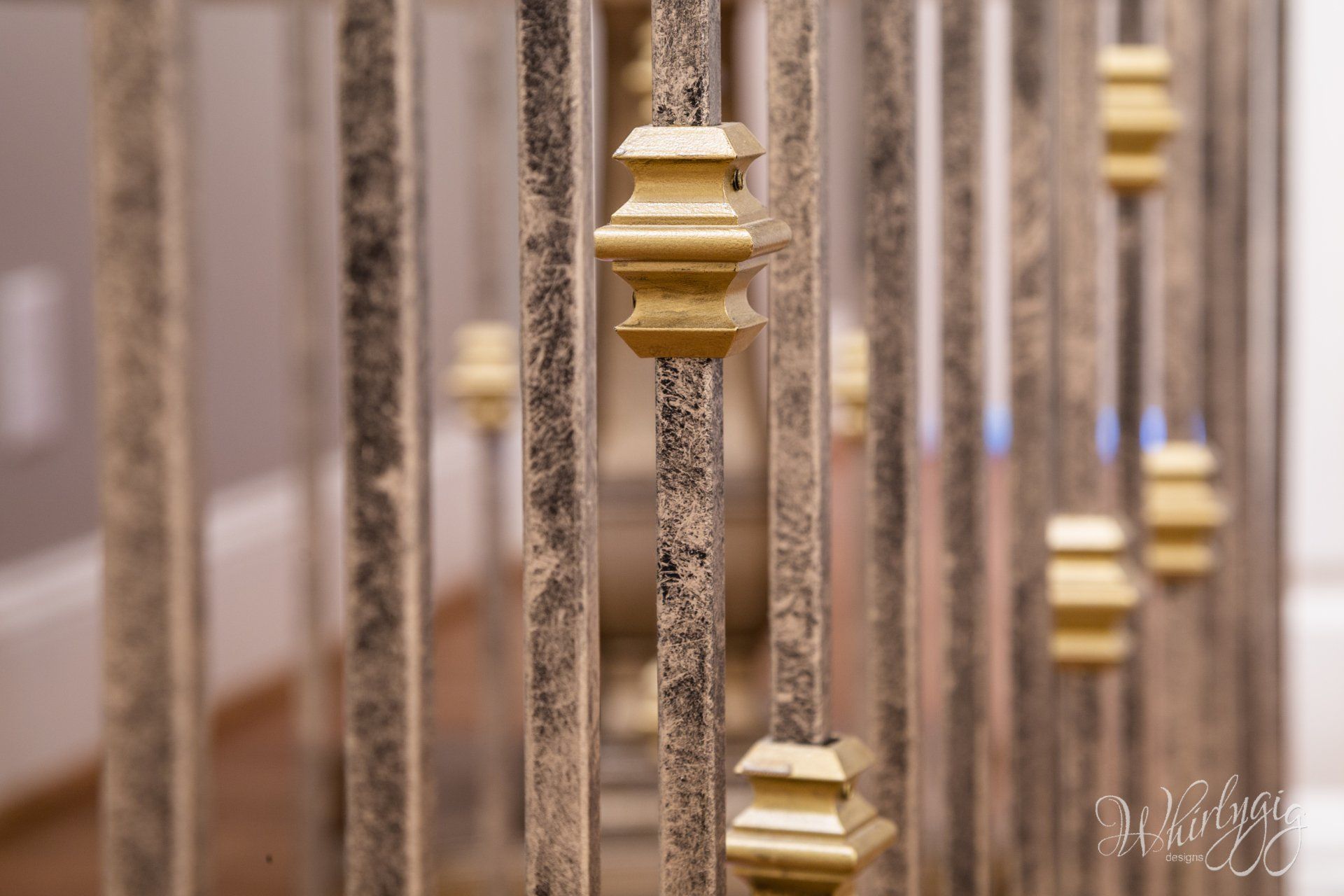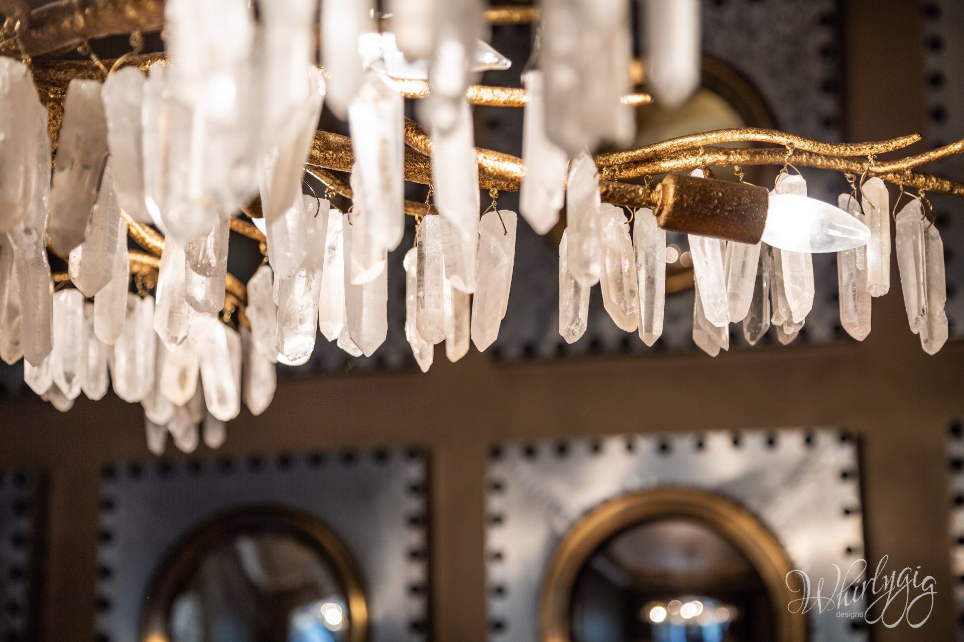 It all started with this statement mirror by Global Views… then we needed appropriate sconces so I used these Crystorama fixtures that are actually intended for use as ceiling mount fixtures but I find them terribly interesting in this application and highly scale appropriate. Then, of course, the fixture over the stairwell HAD to be replaced with this showstopper from Arteriors. The iron balusters are custom painted by Iron Petunia.