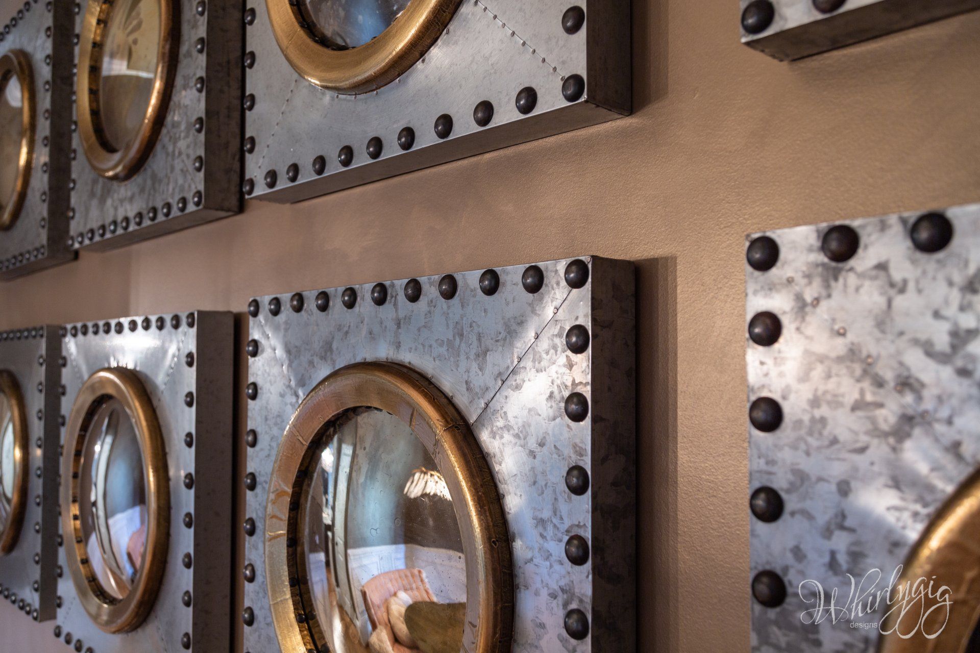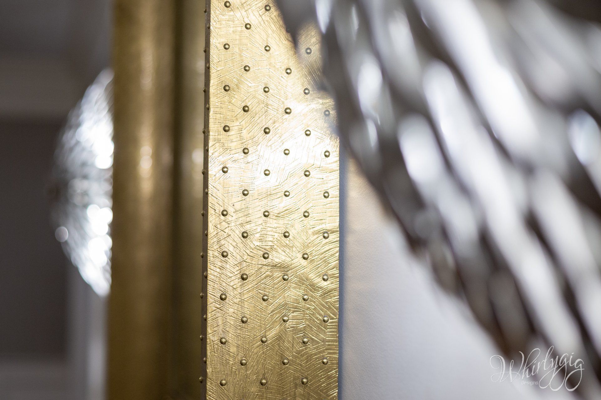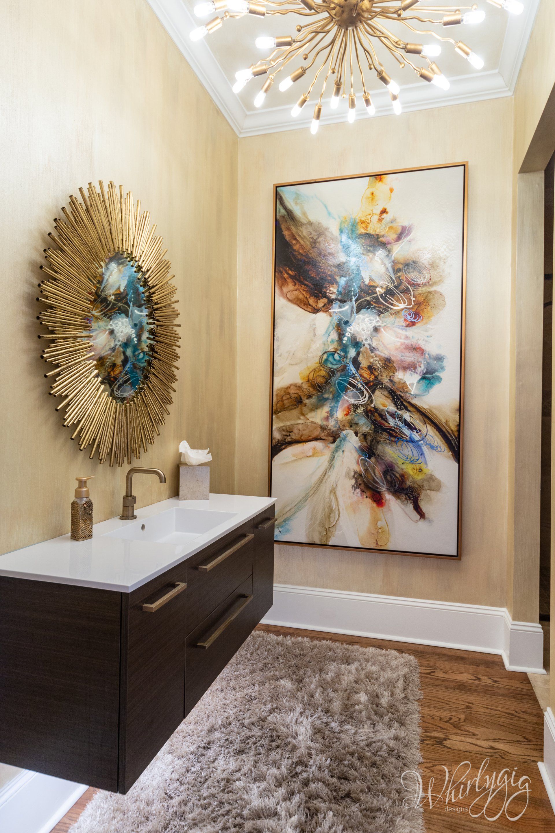 It all started with this statement mirror by Global Views… then we needed appropriate sconces so I used these Crystorama fixtures that are actually intended for use as ceiling mount fixtures but I find them terribly interesting in this application and highly scale appropriate. Then, of course, the fixture over the stairwell HAD to be replaced with this showstopper from Arteriors. The iron balusters are custom painted by Iron Petunia.